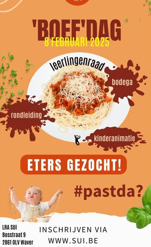 Op zaterdag 8 februari 2025 organiseert de leerlingenraad een 'boef'dag. Leerlingen, ouders, grootouders, oud-leerlingen, leerkrachten, oud-leerkrachten, directie... Kortom iedereen die de leerlingenraad van SUI een warm hart toedraagt, is welkom.