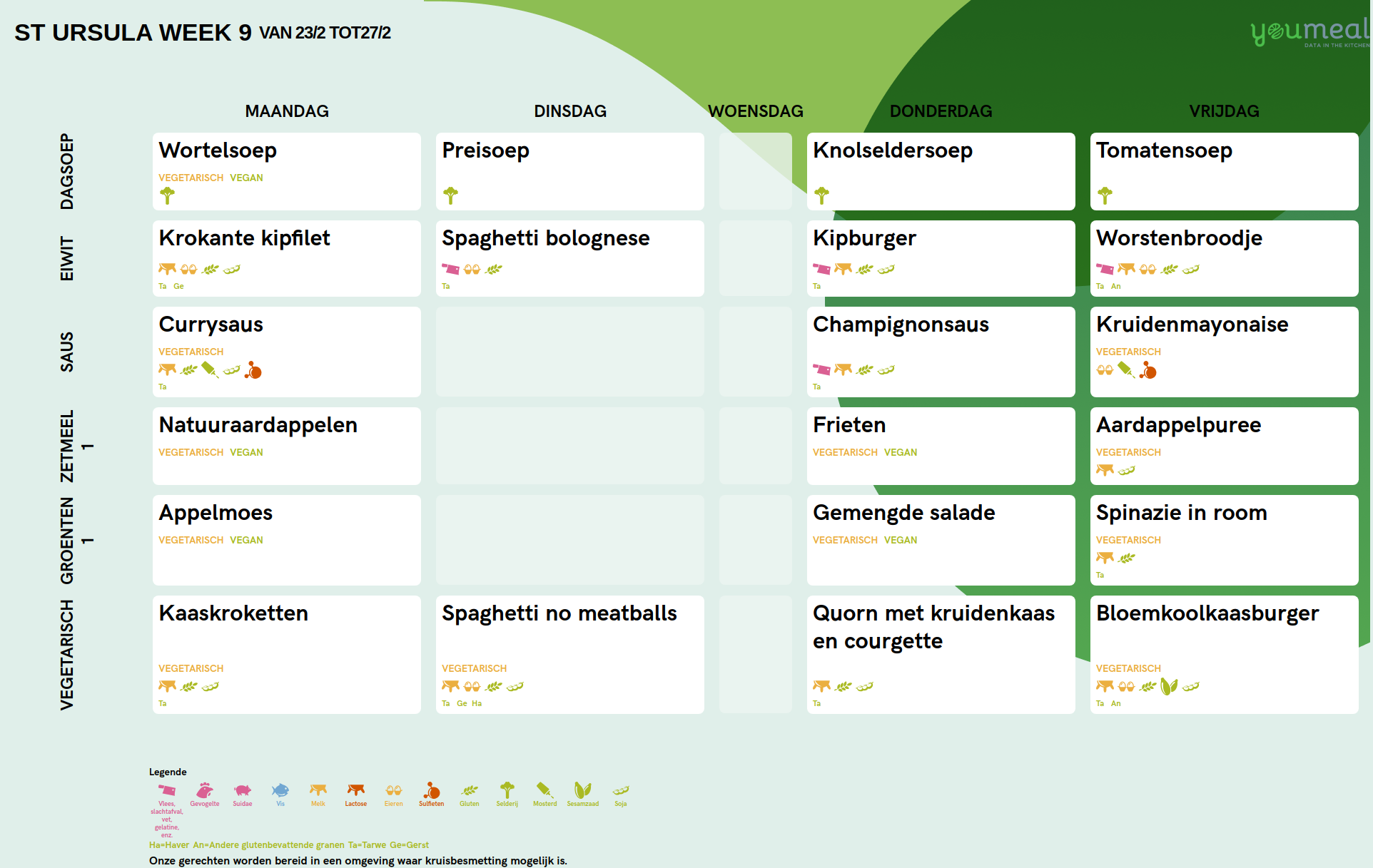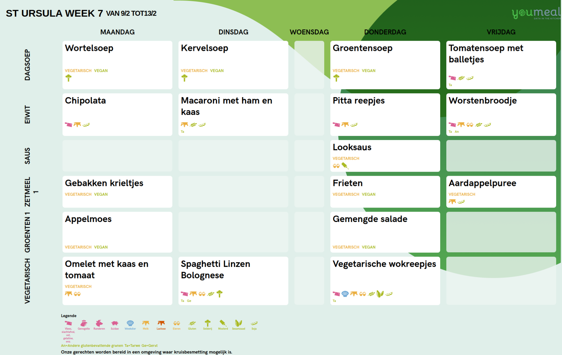 Hieronder vindt u een overzicht van de beschikbare maaltijden in de cafetaria per week.